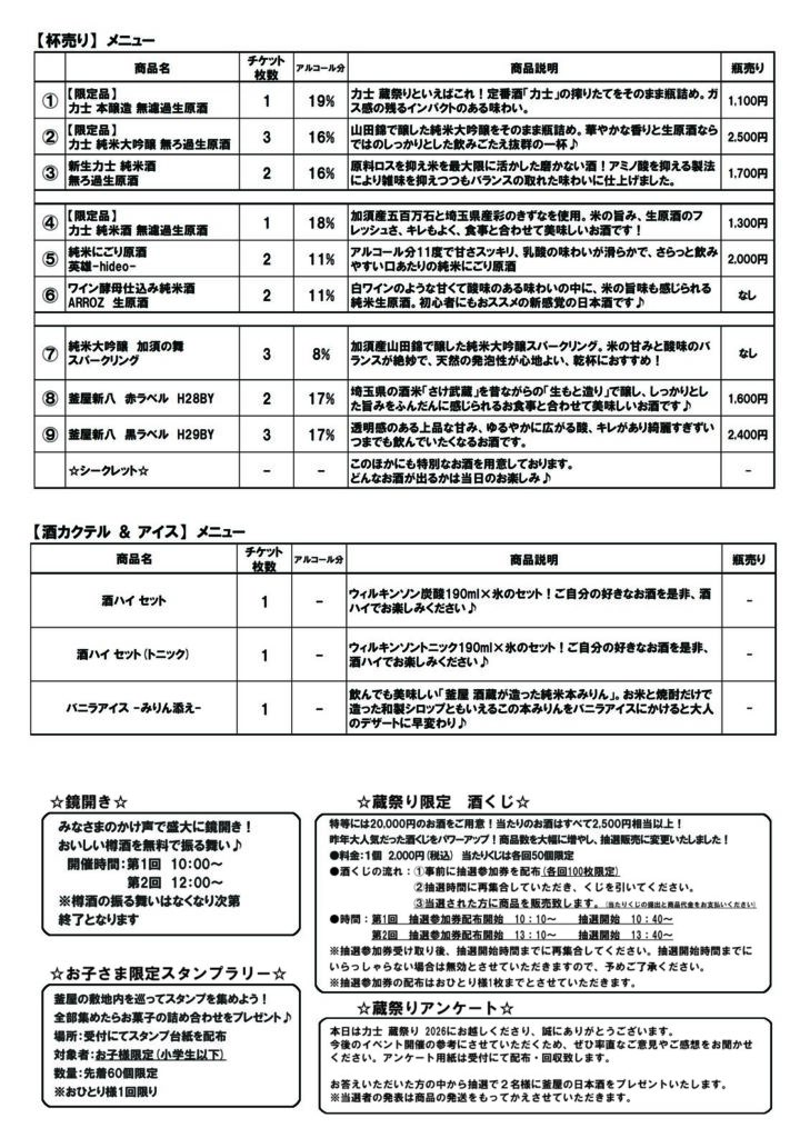 内容:鏡開き、仕込蔵見学ツアー(要事前申し込み)、限定酒の杯売り、限定酒の販売、地元の飲食物、蔵祭り限定 酒くじ等